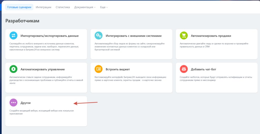 Для создания необходимо перейти в вашем аккаунте Битрикс24 в раздел Приложения/Разработчикам/Другое: