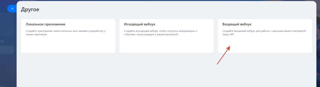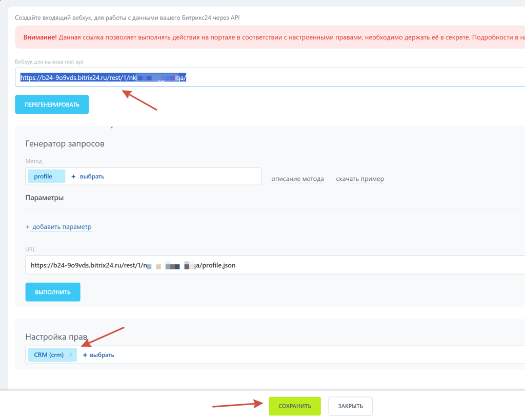 Создать Входящий вебхук с правами доступа «CRM (crm)«