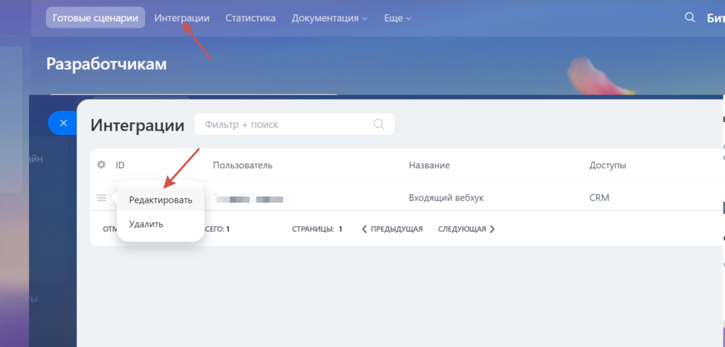 Если нужно отредактировать или удалить интеграцию с сервисом в Битрикс24, это можно сделать в разделе Интеграции.