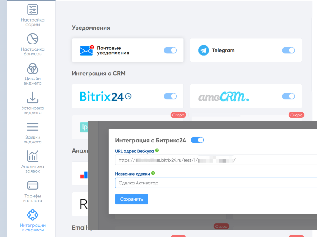 После сохранения интеграции в Битрикс24 и сервисе Активатор настройка завершена.